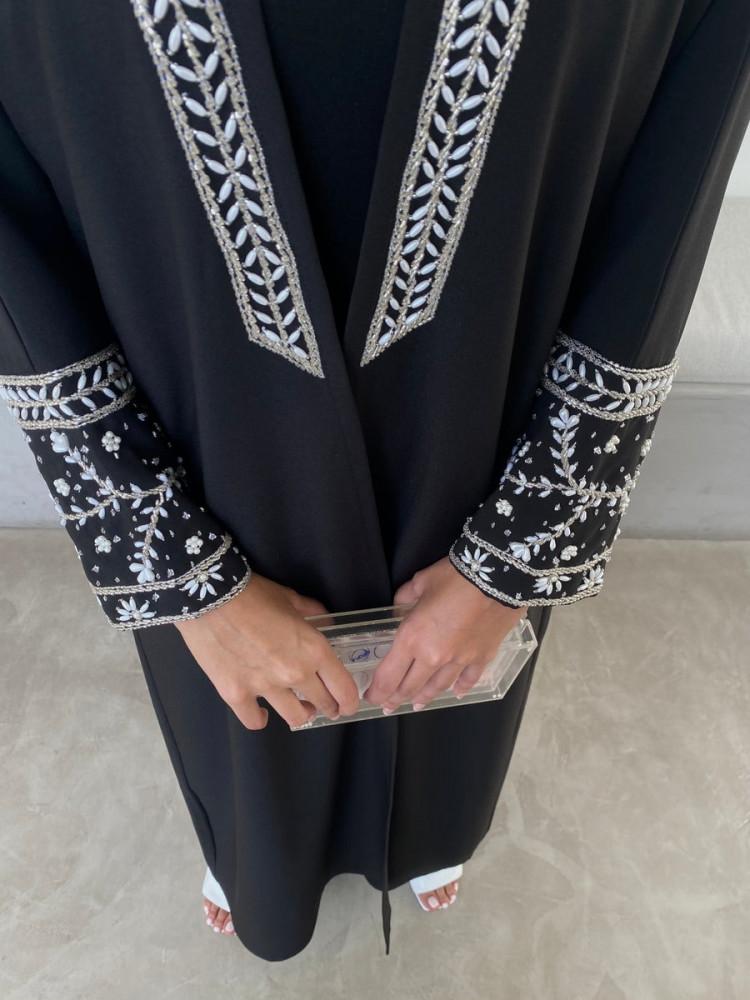 عبايه قصه ساده اسود مطرزه في الصدر واليدين مع شيله ساده