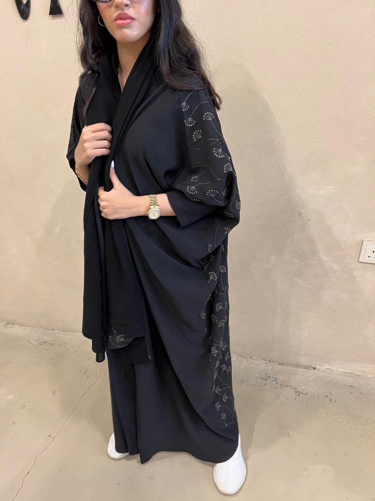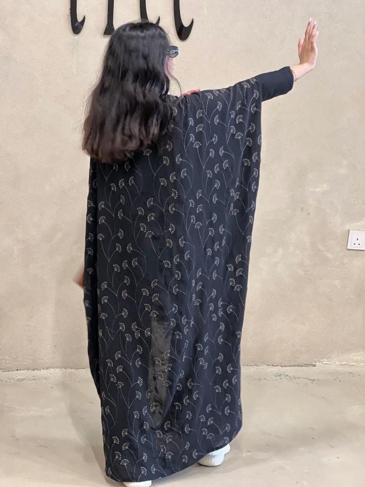 عباية نص بشت مطرزة من الخلف + طرحة لونها اسود